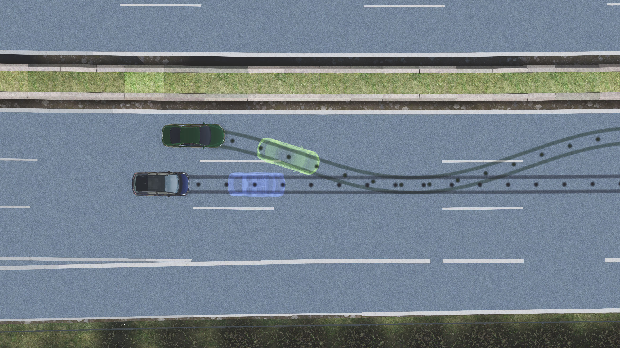 急にハンドルを切るトラック、混雑した高速道路に進入する車両、カーブを曲がった先の臨時の道路工事。scenario.architectではそのような典型的なシナリオを簡単に作成できます。数回のクリックだけで車両の配置、車両特性の定義を行い、減速、加速、旋回などマニューバーの作成を行うことが可能です。
